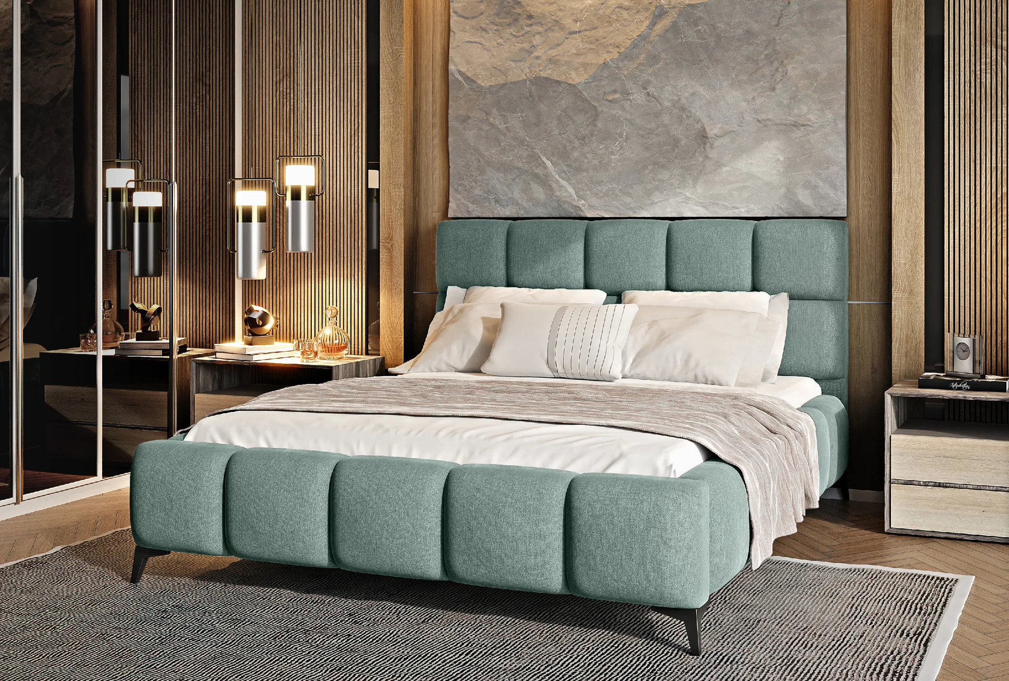 Postel Mist kombinuje současný design s prvky glamour a přináší do ložnice nádech elegance. Čelo je čalouněné a vyplněné měkkou pěnou s jemným prošíváním, což dodává posteli charakter a eleganci.