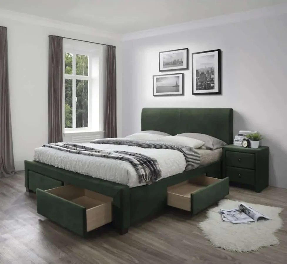 Postel MODENA je čalouněná tmavě zelenou sametovou látkou Velvet, která působí elegantně a příjemně na dotyk. Úložné zásuvky nabízejí praktický prostor pro ložní prádlo a další potřeby, čímž pomáhají udržet ložnici uklizenou. Rošt je součástí balení, matrace se však musí pořídit zvlášť. V naší nabídce najdete široký výběr matrací a doporučujeme volit buď jednu 160x200 cm, nebo dvě 80x200 cm pro ideální podporu. Postel se dodává bez nočního stolku. Celková nosnost až 200 kg (100 kg na osobu). Výška po rošt činí 39 cm. Zboží je dodáváno v demontu. Pro dokonalý vzhled ložnice doporučujeme sladit dekor s tmavě zeleným odstínem a vybrat doplňky s jemným kontrastem.