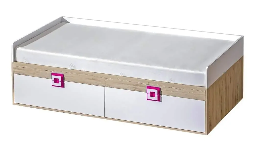 Korpus je provedený v odstínu dub jasný, čela zásuvek pak v matné bílé a doplňují ji stylové úchyty v kombinaci růžová a bílá. Součástí jsou dvě praktické zásuvky, které uvolní místo na ukládání věcí. Rošt je součástí balení, matraci je nutné doobjednat, vhodný rozměr je 90x200 cm. Tento nábytkový styl osloví zejména mladší generaci a skvěle zapadne do dětského, studentského i pokojového prostoru. Sektorový nábytek NIKO nabízí široký výběr modulů, které umožní sestavit pokoj přesně podle vašich představ. Dodáváme v demontovaném stavu.