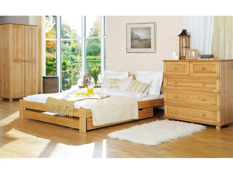 Ilustrativní foto – v ceně postele není úložný prostor. Postel je vyrobena z masivní borovice s mořením v odstínu olše o tloušťce desky 2,6 cm. Ručně barvená a následně lakovaná, broušená a znovu lakovaná pro hladký povrch.
