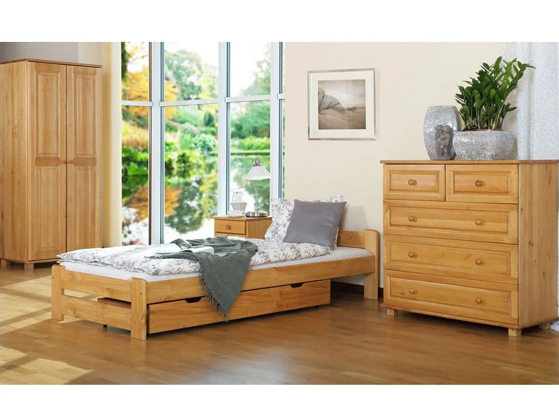 Postel RAFANUS o rozměru 90×200 cm je vyrobena z masivní borovice a ošetřena mořením olše s následným lakováním pro hladký a odolný povrch. Ruční zpracování zahrnuje jemné broušení, barvení a závěrečné lakování, které zajišťuje jednotný vzhled a dlouhou životnost.