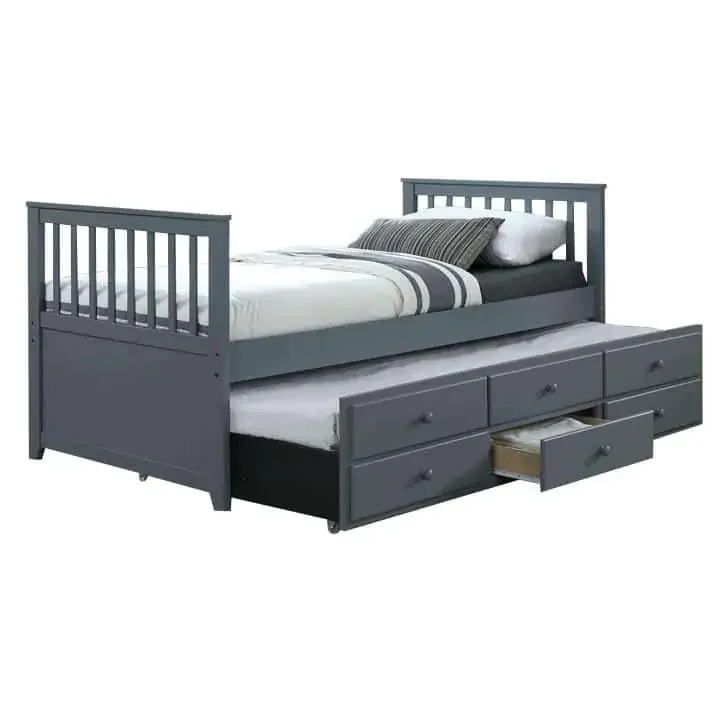 Postel s integrovanou přistýlkou a praktickým úložným prostorem v šedém provedení kombinuje komfortní spaní s úsporou místa. Je vyrobena z masivu a MDF, což zajišťuje pevnou a stabilní konstrukci. Přistýlku lze vysouvat díky pohodlným úchytkám na kolečkách, takže ji zvládne i dítě. Součástí je laťkový rošt. Postel je dodávána bez matrace; doporučujeme vybrat matraci o rozměru 90x200 cm z naší nabídky. Maximální výška matrace pro přistýlku činí 12 cm. Vzdálenost od země k hornímu roštu je 45 cm a k spodnímu roštu 23 cm. Tři výsuvné šuplíky poskytují extra úložný prostor na hračky, knihy a oblečení. Dodáváme ji v demontovaném stavu. Vhodné pro malé i větší ložnicové kouty, jelikož šetří místo a zároveň nabízí pohodlné spaní pro hosty. Dřevěná konstrukce v šedém odstínu se snadno sladí s různými styly nábytku a zajišťuje dlouhou životnost.