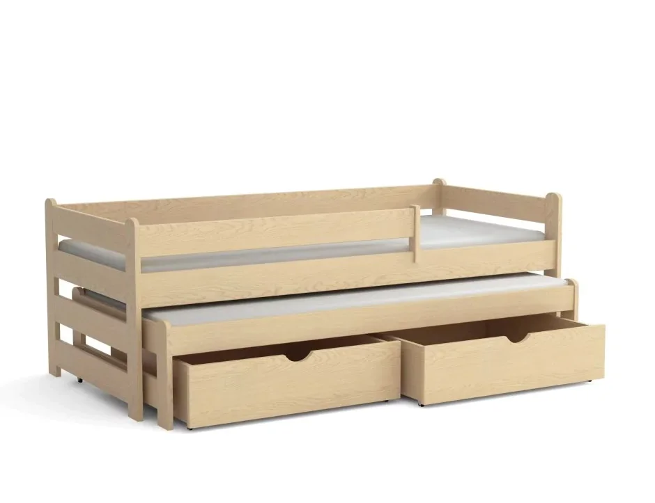 Čela postele jsou z masivu borovice a korpusy ze DTD lamina; při objednávce v surovém stavu je dodávka celodřevěná, pro barevné provedení jsou k dispozici bílé korpusy. Počet latí v roštu činí 11 kusů na lůžko. Pokud je na obrázku zábrana, je součástí postele; matrace ani textilní doplňky nejsou součástí balení. Materiál zahrnuje 26 mm masiv borovice, bukové kolíky a kovové spoje, DTD lamino; povrchová úprava AKRYCOL COLORLAK pro dětský nábytek. Výběr rozměru matrace odpovídá skutečnému rozměru matrace, například varianta 80 x 180 cm znamená matraci 80 x 180 cm; u postele s přistýlkou bývá matrace pro horní lůžko stejného rozměru a matrace pro přistýlku je vždy kratší na délku o 10 cm, tedy 80 x 170 cm. Zboží je dodáváno v demontu. Snadná montáž a praktické ukládání usnadní přesun a případné změny v uspořádání pokoje. Bezpečný a odolný povrch zajišťuje rychlé a bezstarostné používání pro děti.