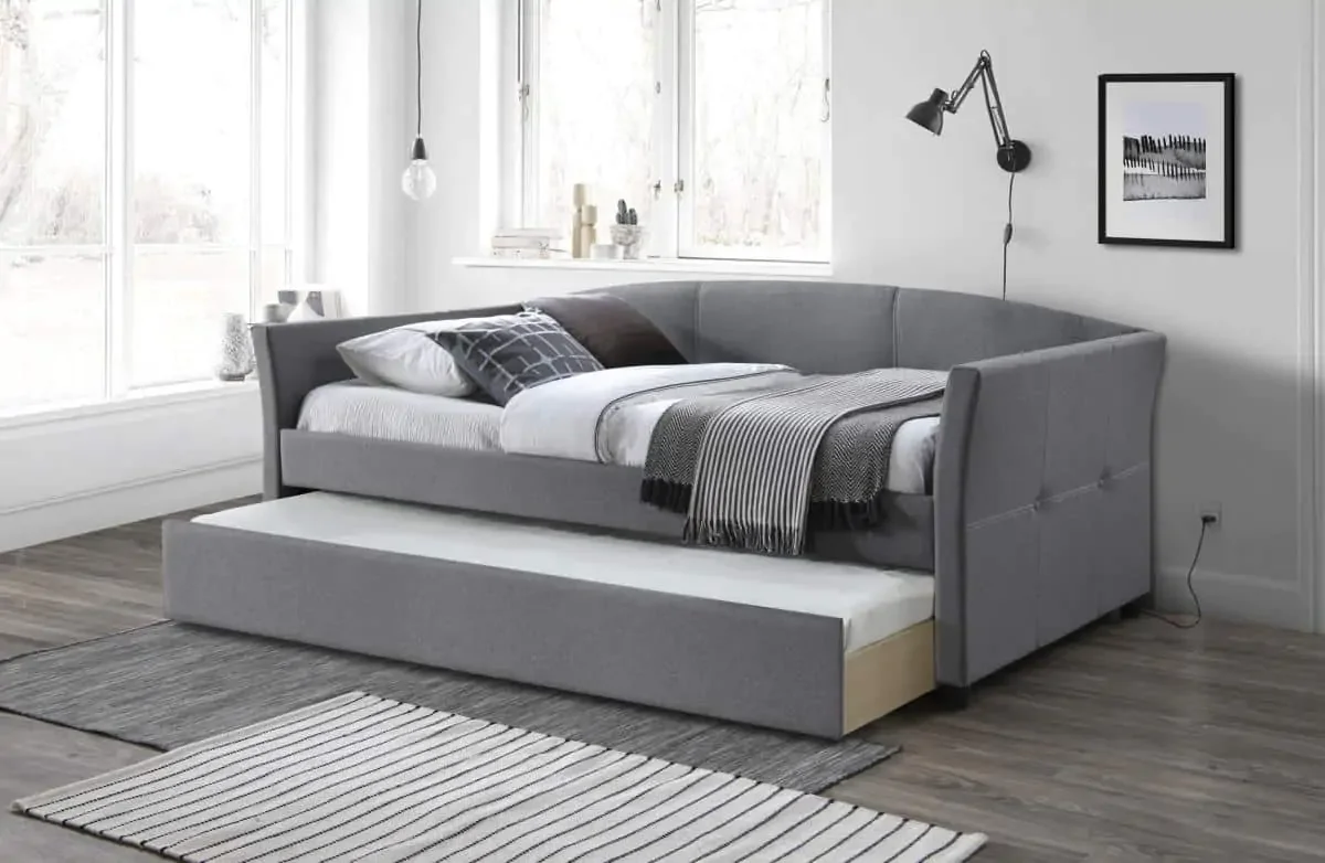 Postel SANNA nabízí pevný základ každé ložnice díky vyváženému spojení stylu a praktičnosti. Rám je čalouněn látkou v šedé barvě a dodává se v demontu, bez matrací. Rozměry rámu jsou 97×221×80 cm a plocha na spaní i přistýlky má rozměr 90×200 cm.