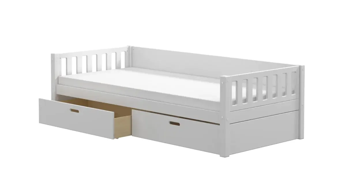 Pevná konstrukce vzniká kombinací masivního borového dřeva a MDF, což zajišťuje dlouhou životnost a nadčasové linie. Postel Viggo s úložným prostorem nabízí praktické zásuvky pod rámem, do kterých uložíte hračky, textil i další potřeby. V balení najdete postel, lamelový rošt a sadu dvou zásuvek se krycími deskami; součástí je návod k montáži. Zboží je dodáváno v demontu bez matrace; doporučujeme dokoupit matraci 90 x 200 cm. Součástí balení nejsou žádné doplňky ani dekorace.