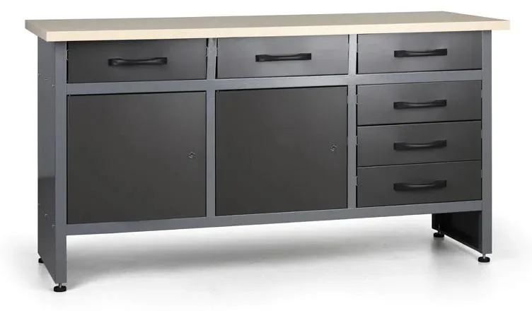 Robustní pracovní stůl HOBBY III s rozměry 840 x 1600 x 600 mm nabízí pevnou konstrukci z odolného ocelového plechu a praktické řešení pro vaše dílenské práce. Disponuje šesti prostornými zásuvkami s nosností 20 kg, bezpečnými skříňkami uzamykatelnými dvěma klíči a stabilní pracovní deskou z odolné laminované dřevotřísky o tloušťce 31 mm.