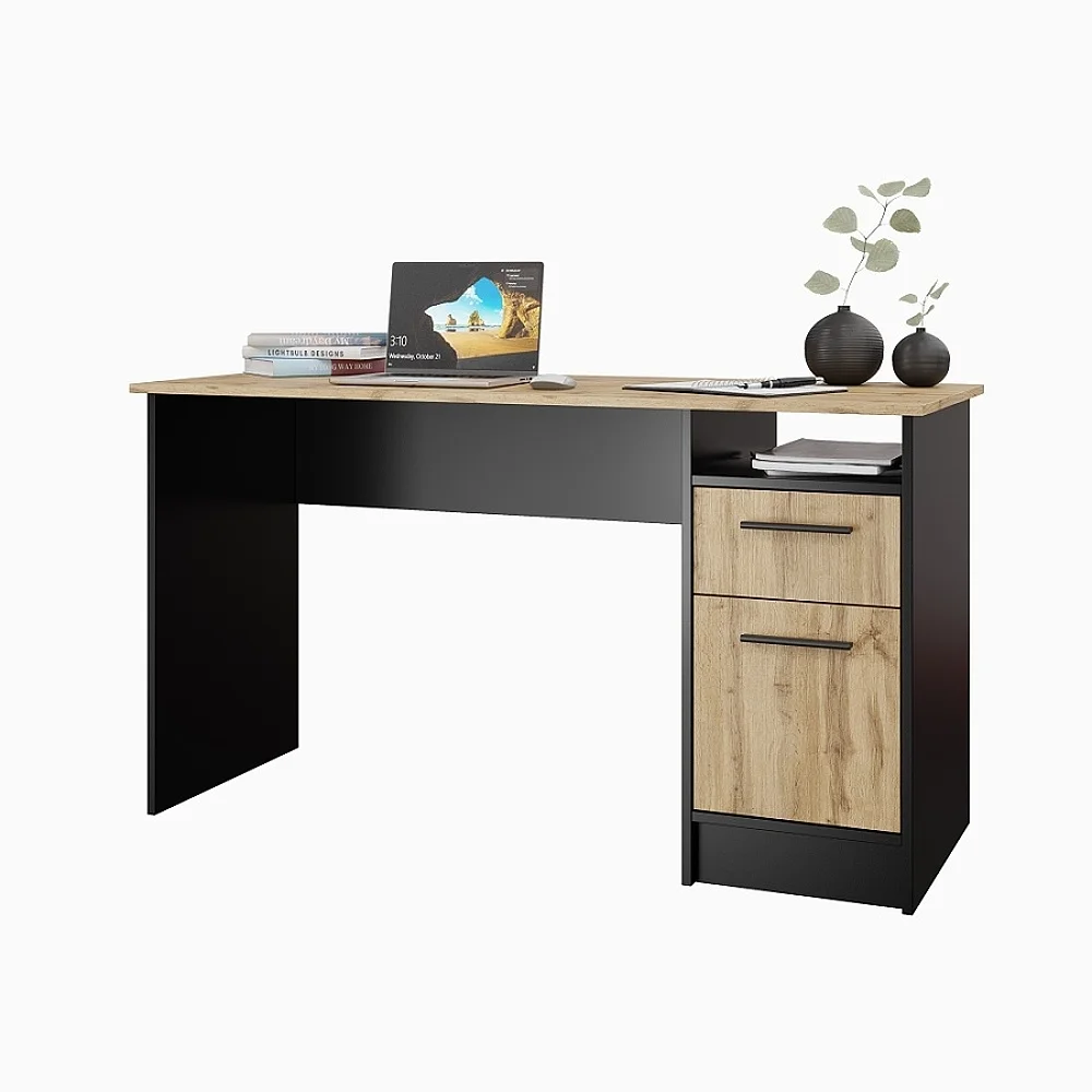 Pracovní stůl NEJBY TRESON I v kombinaci černé s dekorem dub wotan přináší moderní vzhled a odolný povrch z lamina pro každodenní použití. Rozměry 138 × 76 × 55 cm poskytují dostatek místa pro počítač, monitor a dokumenty.
