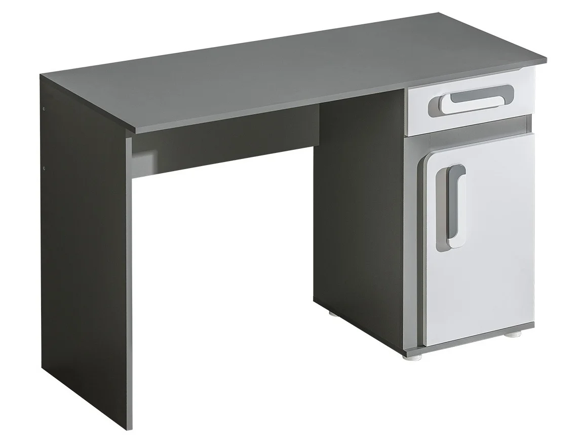 Pracovní stůl z řady ORAKI představuje netradiční barevné provedení a stylové úchyty, které osloví mladší generaci. Je vyroben z kvalitní LTD desky (lamino) s ABS hranou, korpus je v antracitové šedé a dvířka i čela zásuvek jsou bílé matné.