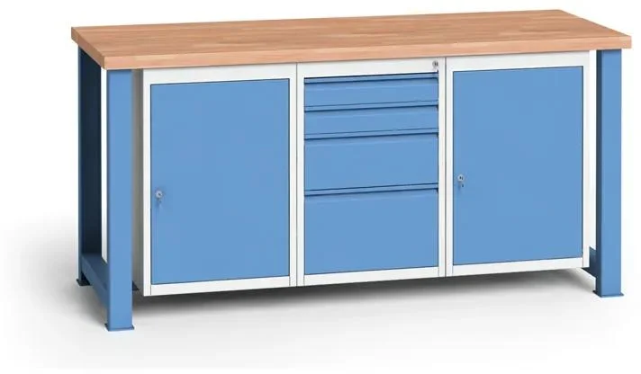 Vysoce stabilní dílenský pracovní stůl s rozměrem 1700 mm je ideální pro náročné práce. Jeho pevná konstrukce kombinuje masivní bukovou spárovku s tloušťkou 40 mm na pracovní desce a robustní ocelové nohy o tloušťce 3 mm, které jsou pečlivě svařené a práškově lakované v šedé barvě.