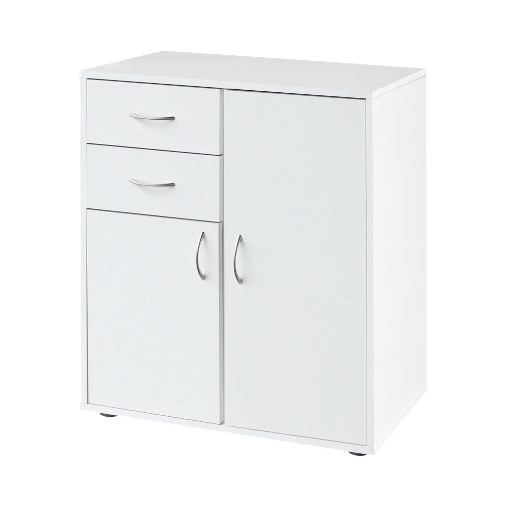 Dvoudveřová komoda se dvěma zásuvkami v čistě bílé barvě je praktickým doplňkem každé ložnice či prádelny. Rozměry 70 cm na šířku, 35 cm na hloubku a 82 cm na výšku doplňuje hloubka zásuvky 30 cm, což umožňuje ukládat prádlo i drobnosti pohodlně.
