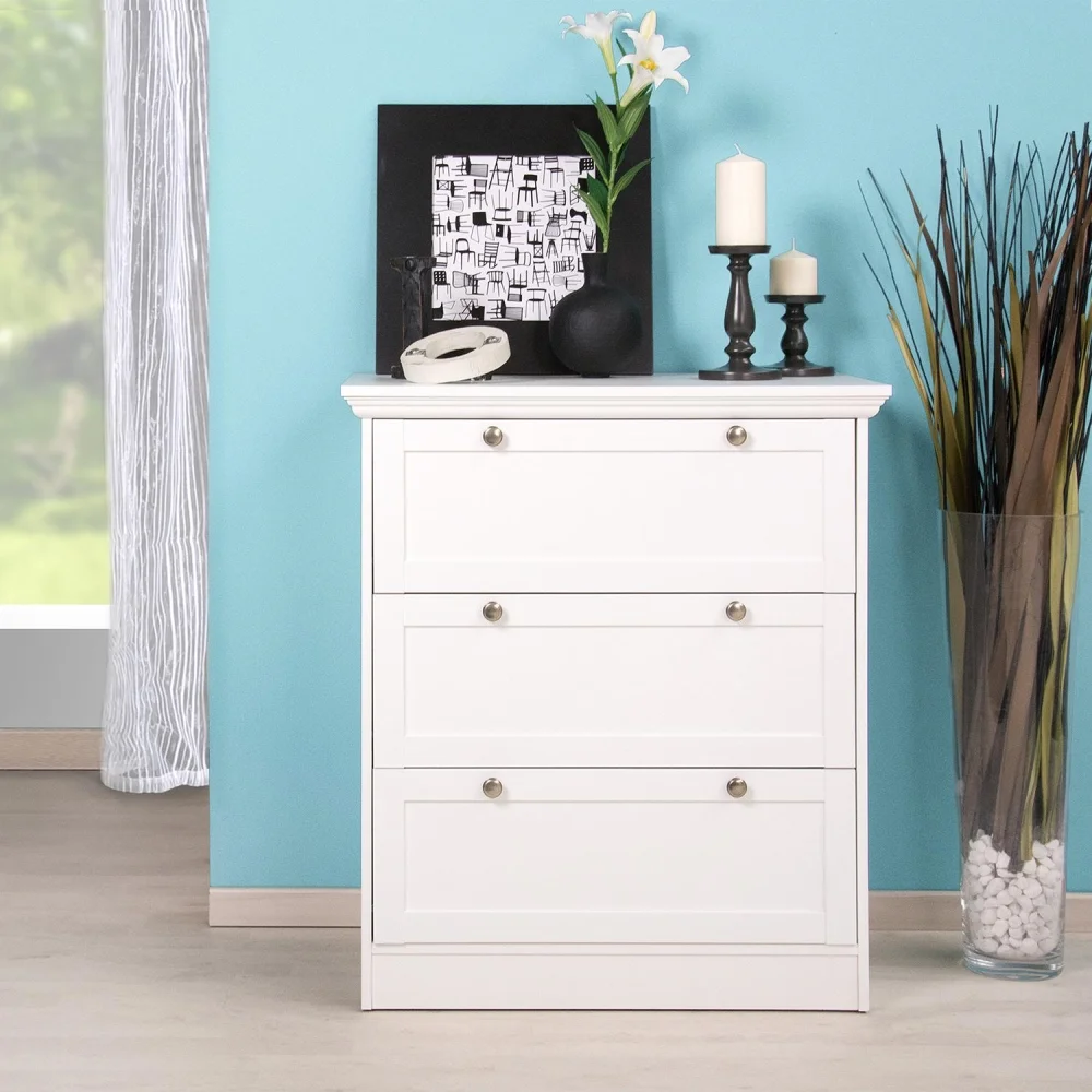 Prádelník HUNGABEE se třemi zásuvkami v bílé barvě spojuje praktičnost s nadčasovým designem. Rozměry: šířka 80 cm, výška 90 cm a hloubka 45 cm ukazují kompaktní, ale prostorný nábytek vhodný do každé prádelny.