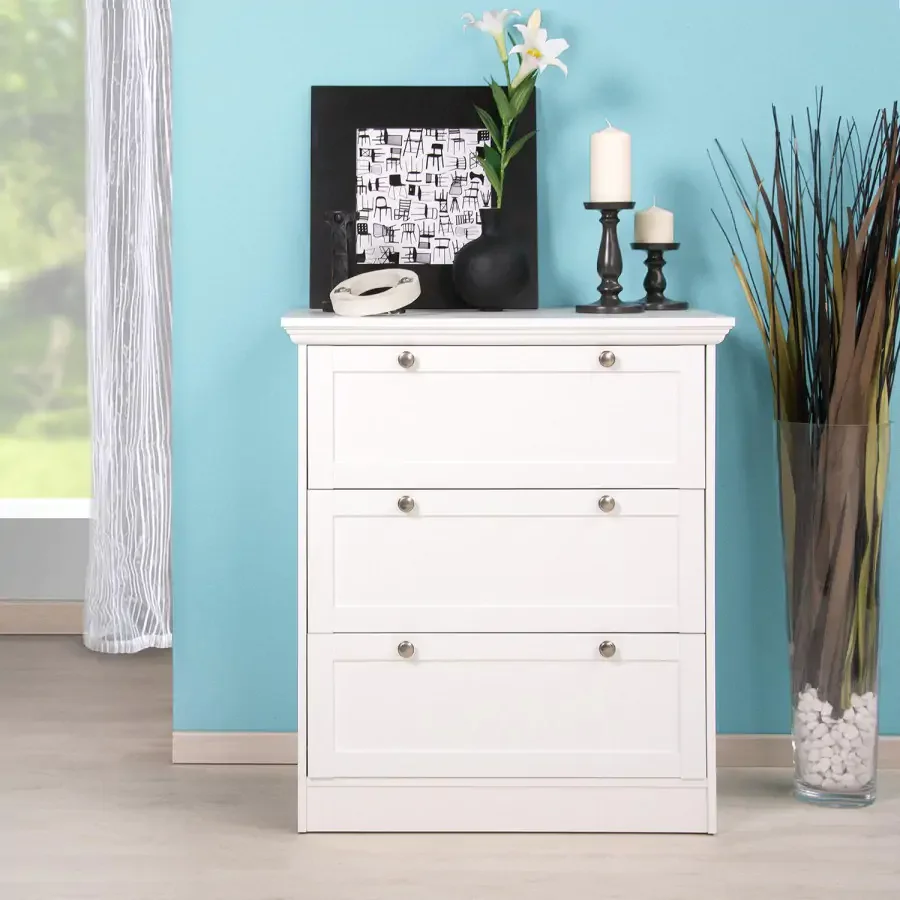 Disponuje tři zásuvky s úchytkami ve vintage stylu, které nabízejí dostatek úložného prostoru a zároveň doplňují celkový design. Klasická forma série Landwood vychází z jemně stylizovaných dekorů, takže nábytek působí luxusně a harmonicky. Nábytek se dodává v demontu, usnadňuje přepravu a montáž je rychlá. Díky neutrální bílé barvě se snadno sladí s různými odstíny a stylovými doplňky a díky kompaktním rozměrům je vhodný i do menších interiérů.