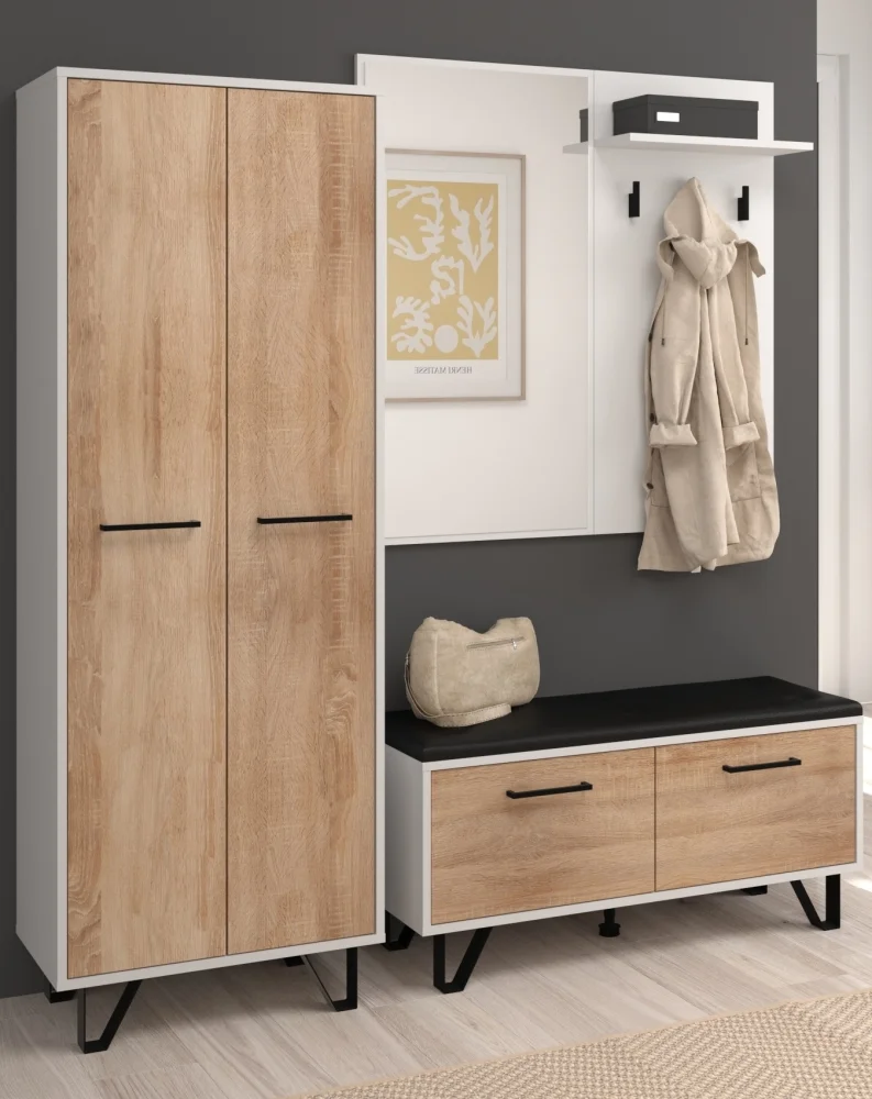 Předsíň PRUDHOE v kombinaci bílé a duba sonoma vytváří moderní a praktický vstupní prostor. Díky volné volbě dílů si sestavu můžete poskládat podle rozměrů a potřeb. Vzorová konfigurace zahrnuje skříň 60 × 170 × 39 cm, věšákový panel se zrcadlem 100 × 100 × 18 cm a botník 100 × 48 × 39 cm; barevné provedení doplňují černé nožky a úchytky.