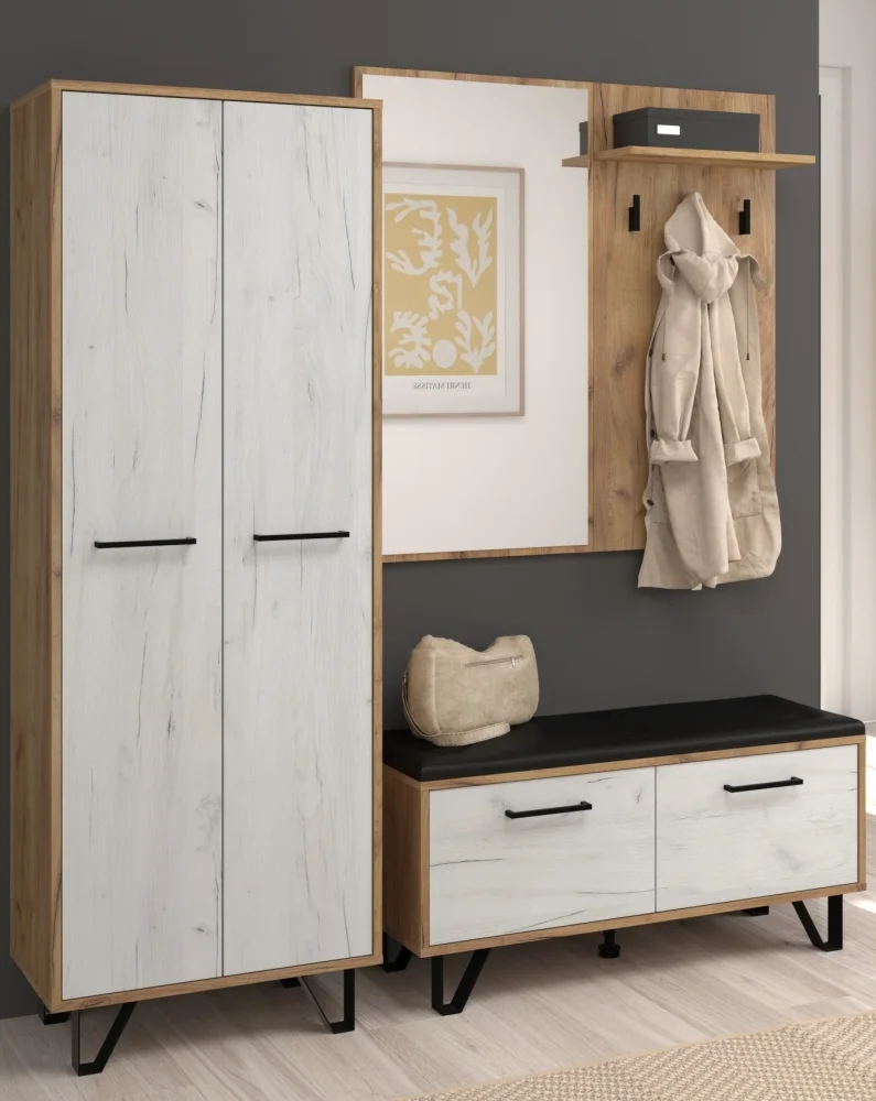 V uvedené ukázce najdete: skříň 60 × 170 × 39 cm, věšákový panel se zrcadlem 100 × 100 × 18 cm a botník 100 × 48 × 39 cm. Barva je kombinací craft zlaté a craft bílé, nožky a úchytky jsou černé. Výška nožek činí 12 cm a povrch tvoří 16 mm lamino s ABS hranami; nožky jsou kovové. Systém nabízí tiché dovírání, které zajišťuje klidné a plynulé uzavírání. Dodáváno v demontu. Záruka 5 let.