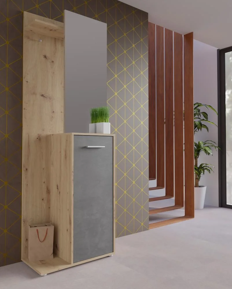 Praktická předsíňová stěna se zrcadlem kombinuje barvu dub artisan a šedé odstíny, což působí moderně a efektivně šetří prostor. Rozměry 60 x 180 x 32 cm a lamino povrch zajišťují odolnost a snadnou údržbu.