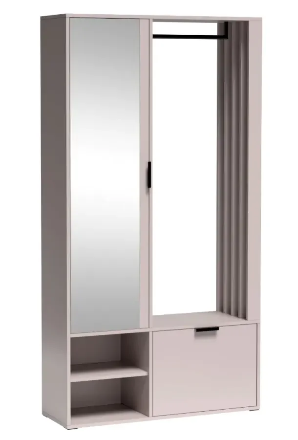 Moderní předsíňová stěna Lamont je vyrobená z kvalitní 16 mm laminátové desky v odstínu kašmír, který kombinuje béžovou barvu s jemným růžovým nádechem. Boční část sestavy tvoří lamely, které dodávají vizuální zajímavost a moderní vzhled. Sestava zahrnuje věšákový panel, botník a skříň se zrcadlem a volným prostorem pro uložení věcí. Rozměry jsou uvedeny na obrázku. Jednotku lze složit na obě strany, což z ní dělá univerzální řešení pro různé dispozice chodby. Dodáváme v demontovaném stavu pro snadnou montáž a flexibilní instalaci. Univerzální modulární provedení umožňuje přizpůsobit uspořádání prostoru vašim potřebám a rychle tak vytvořit praktický vstupní prostor.