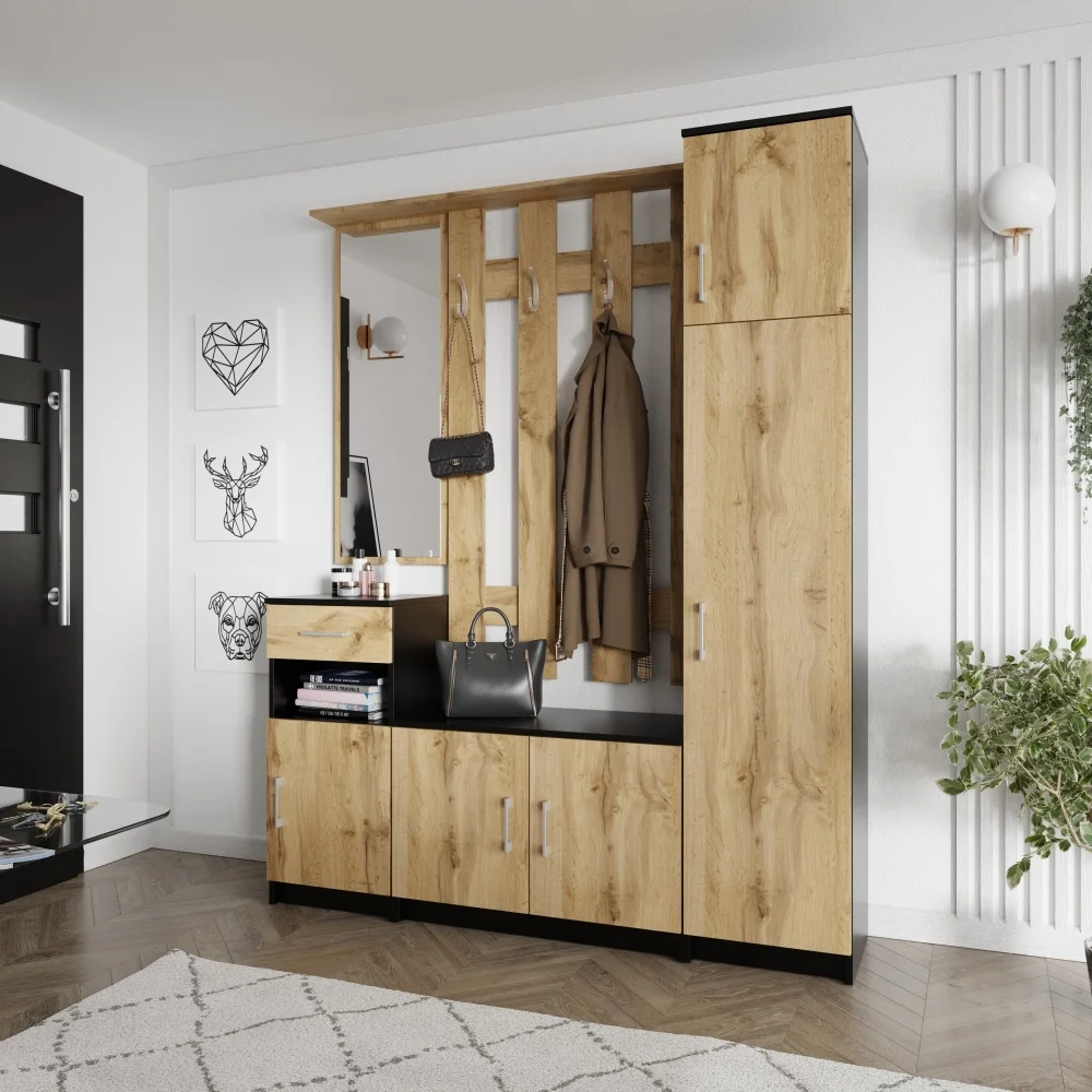 Moderní předsíňová stěna Mariana kombinuje černý korpus s dvířky v dekoru dub wotan, čímž tvoří nadčasový kontrast. Je vyrobena z kvalitního Laminátu LTD, který zaručuje odolnost vůči opotřebení a snadnou údržbu. Sestava zahrnuje jednotlivé prvky, které lze instalovat nezávisle: zrcadlo (40 x 112 x 2 cm), věšák (80 x 142 x 15 cm), komoda (40 x 87 x 38 cm), botník (80 x 55 x 38 cm) a skříň (40 x 202 x 38 cm). Celkové rozměry celé sestavy jsou 160 x 202 x 38 cm. Dodání v demontu. Díky modulární konstrukci a praktickým úložným prostorům rychle uspořádáte předsíň a zrcadlo s věšákem lze umístit podle potřeby, aby vyhovovaly vašemu prostoru a stylu.