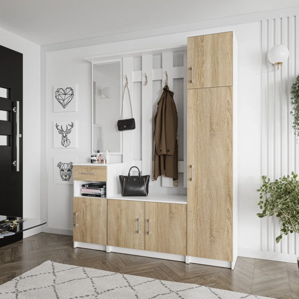 Předsíňová stěna NEJBY MARIANA kombinuje bílé provedení korpusu s dekorem dub Sonoma pro svěží a nadčasový vzhled. Jednotlivé díly lze instalovat samostatně, takže si uspořádání snadno přizpůsobíte podle prostoru.