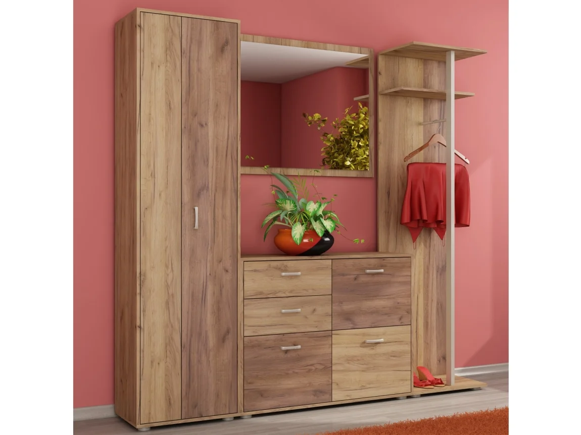 Předsíňová stěna STANSBURY nabízí kombinaci stylu a praktičnosti pro váš vstupní prostor. Rozměry 211 × 198 × 37 cm zajistí dostatek místa pro každodenní potřeby. Uvnitř najdete šatní tyč a polici, botník se třemi výklopnými dvířky a dvěma zásuvkami pro přehledné ukládání obuvi i doplňků.