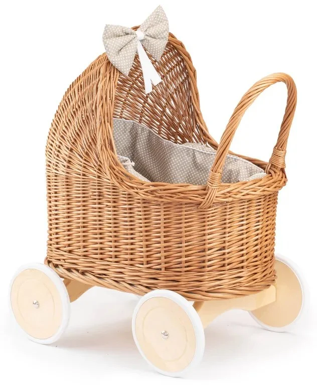 Elegantní a kvalitní proutěný kočárek určený pro panenky Nukke, inspirovaný finským přístupem k výchově a hrám. Tento tradiční medový košík je vybaven kolečky a pohodlnou rukojetí, což umožňuje snadné přenášení a manipulaci.