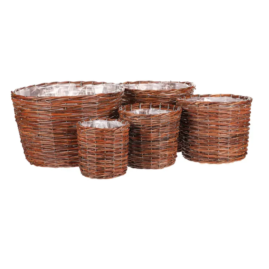Sada pěti kulatých proutěných obalů na květiny v přírodním odstínu PRP305 spojuje jednoduchou eleganci s praktickým využitím. Set nabízí více velikostí, takže je vhodný pro různé druhy květin i dekorativních aranžmá.