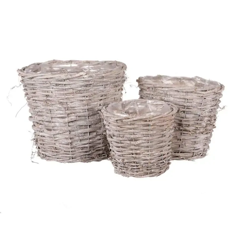 Vytvořte stylový doplněk interiéru s proutěným obalem ve vintage designu, zdobeným motivem révy bělené. Tato sada obsahuje 3 kusy, které lze použít na květináče či dekorativní nádoby. Rozměry jednotlivých kusů: S – 17x17x15 cm, M – 20,5x25,5x19 cm, L – 25x25x23 cm. Cena je uvedena za jeden set.
