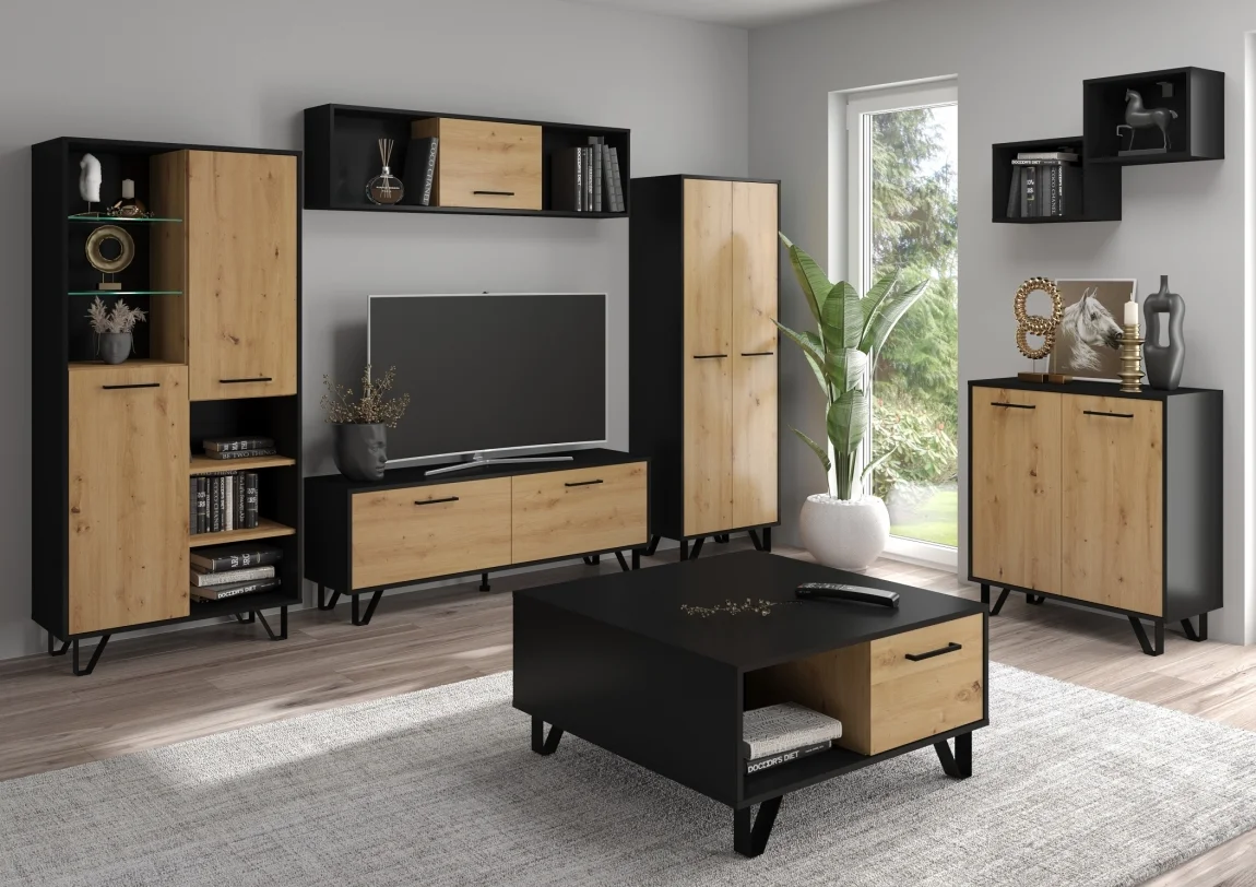 Mezi dostupné prvky patří 2D police regál (80 x 170 x 39 cm), 1D závěsná skříňka (140 x 38 x 25 cm), televizní stolek 140 cm (š x v x h: 140 x 50 x 39 cm), 2D skříň (60 x 170 x 39 cm), 2D konferenční stolek (85 x 42 x 90 cm), 2D komoda (80 x 87 x 39 cm) a police (80 x 50 x 23 cm). Barva kombinuje černou s dub artisan dekorem; nožky a úchyty jsou černé, výška nožek 12 cm. Materiál tvoří lamino tloušťky 16 mm s ABS hranami; nožky jsou kovové. Systém nabízí tiché dovírání a dodává se v demontu. Záruka činí 5 let. Díky modulárnímu systému lze snadno upravovat rozvržení a případně rozšířit sestavu podle prostorových podmínek. Vysoká kvalita zpracování zaručuje dlouhodobou spokojenost a bezproblémový úložný prostor.