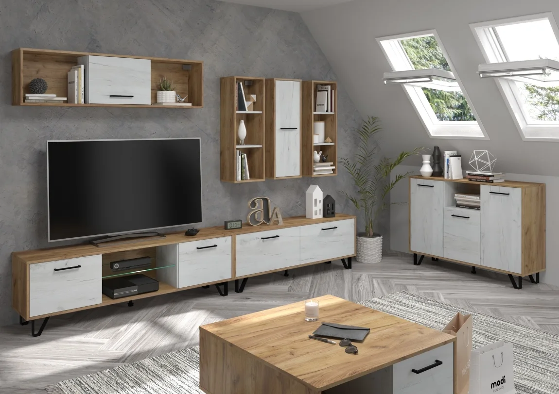 Mezi součásti patří televizní stolek 140 × 50 × 39 cm a 160 × 50 × 39 cm, závěsná skříňka 1D 140 × 38 × 25 cm, dvě závěsné skříňky 1P 32 × 90 × 23 cm, závěsná skříňka 1DP 32 × 90 × 25 cm, komoda 3D 120 × 87 × 39 cm a konferenční stolek 2D 85 × 42 × 90 cm. Barva kombinuje craft zlatou a craft bílou, nožky a úchytky jsou černé a výška nožek činí 12 cm. Materiálovou základnu tvoří 16 mm lamino s ABS hranami, nožky jsou kovové. Systém tichého dovírání zajišťuje pohodlné tiché používání. Dodáváno v demontu; na výrobek se vztahuje záruka 5 let. Modulární systém umožňuje flexibilní uspořádání podle prostoru a potřeb. Doplňky v podobě dvou barevných odstínů dodávají interiéru moderní a nadčasový vzhled, který snadno sladíte s dalším nábytkem.
