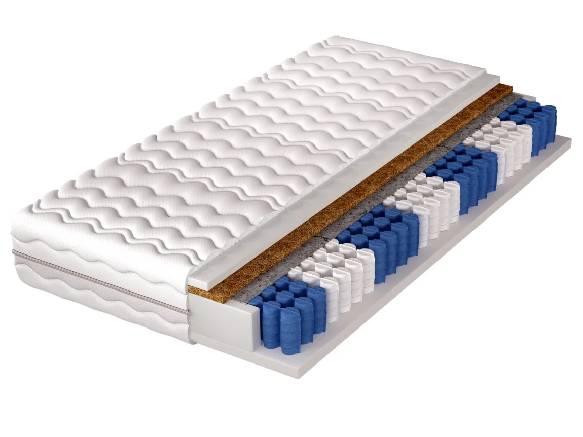 Dvoustranná taštičková matrace o rozměru 180 × 200 cm kombinuje jednotlivé pružiny uložené v samostatných kapsách, které umožňují nezávislou reakci na pohyb těla. Pružiny tvoří sedm zón podpory, čímž zajišťují cílenou oporu různým partiím páteře a různou tuhost. Pružiny nejsou spojeny, takže každá pracuje samostatně a předchází deformacím matrace při tlaku na malé ploše. Po obou stranách ji doprovází 2 cm polyuretanové pěny a na jedné straně navíc 1 cm kokosové vrstvy, což zvyšuje komfort a prodyšnost. Počet pružin činí 262 ks na m². Matraci je možné využívat i z hlediska hygieny díky hypoalergenním materiálům. Potah je snímatelný a pratelný v pračce, šitý s zipem ve tvaru písmene C; prošívání a vzor se mohou lišit od fotografie. Tuhost je koncipována jako oboustranná: jedna strana H3 (střední) a druhá strana H5 (tvrdá). Rozměry: šířka 180 cm, hloubka 200 cm, výška 19 cm. Nosnost na jedno lůžko činí 100 kg.