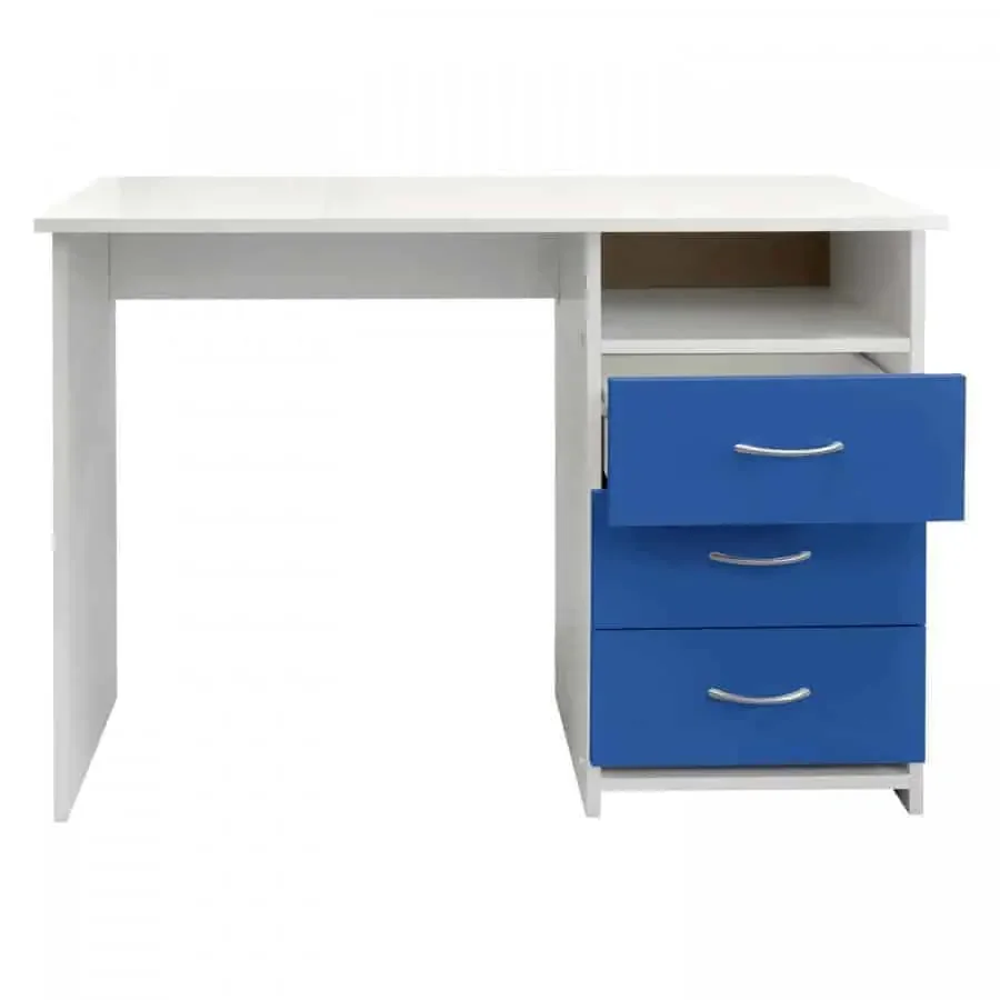 Vyrobený z laminované dřevotřísky v bílé a modré kombinaci, tento psací stůl spojuje jednoduchost s praktickou dispozicí. Disponuje třemi zásuvkami a nad nimi police pro ukládání dalších věcí, které budete mít po ruce. Zásuvky se montují výhradně na pravou stranu. Dodáváno v demontu pro snadnou a rychlou montáž doma. Přes svěží barevné provedení se hodí do dětského i studentského pokoje a díky odolnému povrchu z laminované dřevotřísky je údržba jednoduchá. Další výhodou je praktická organizace pracovního prostoru, která pomůže udržet pořádek během studia i při psaní poznámek.