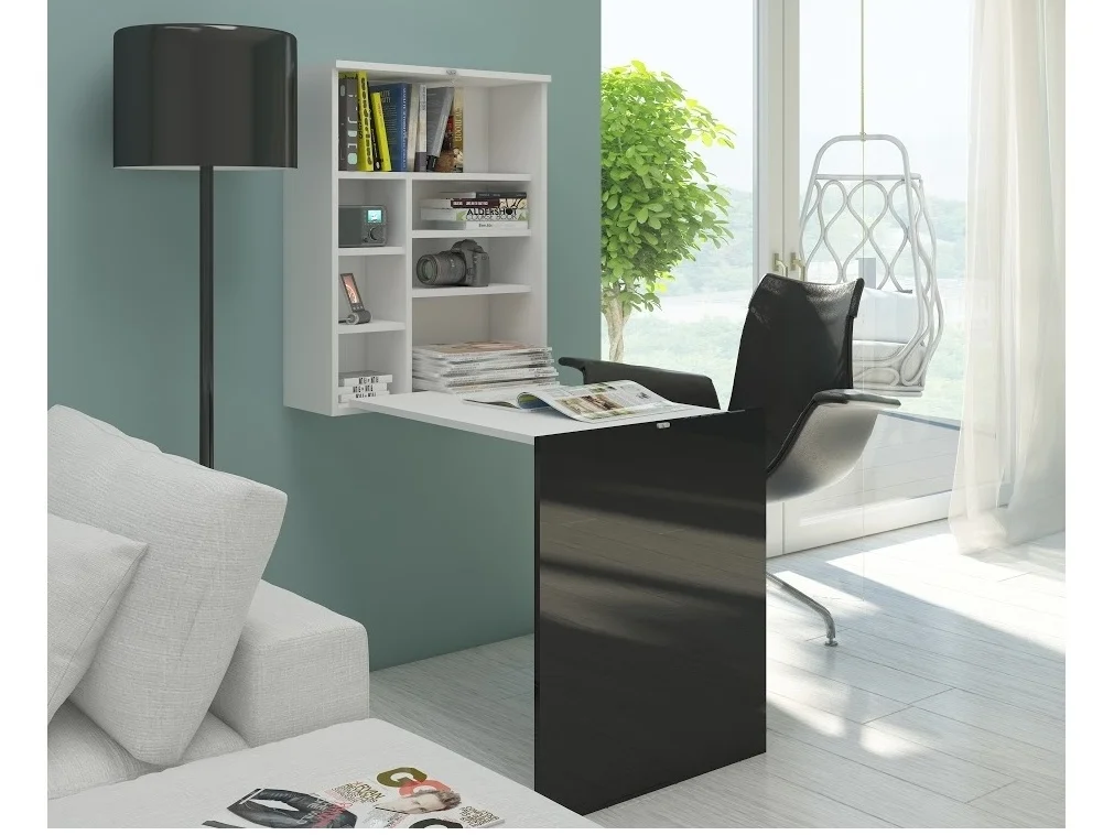 Moderní psací stůl ANDIJON určený pro zavěšení na zeď kombinuje elegantní bílo-černý lesk s praktickým flexibilním řešením. Díky skládacímu provedení ho snadno složíte a rozložíte podle potřeby, což je ideální volba pro malé prostory.
