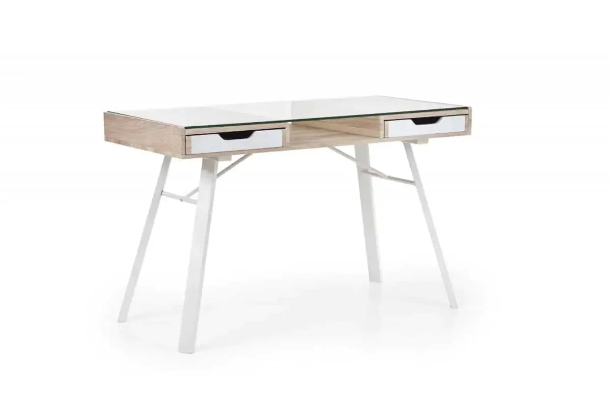 Stůl B-33 od Halmar zaujme svým moderním designem a elegantní linií, která se hodí do různých interiérů. Jeho konstrukce kombinuje bíle lakované ocelové nohy, skleněnou desku a laminovanou MDF v dekoru dub sonoma, což zajišťuje stylový vzhled a dlouhou životnost. Součástí jsou dvě praktické zásuvky a odkládací prostor pod skleněnou deskou pro pohodlné uspořádání kancelářských potřeb. Díky neutrálnímu provedení se stůl hodí do pracovny, studentského pokoje i do obývacího nebo ložnicového prostoru. Dodáváno v demontu a s jednoduchou montáží, kterou zvládne každý. Navíc díky odolné povrchové úpravě a stabilním nohám bude spolehlivým partnerem pro každodenní práci.