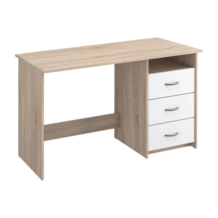 Praktický a jednoduchý psací stůl nabízí tři zásuvky s kovovými pojezdy a nad nimi prostor pro rychlý odkládání drobností či dokumentů. Deska a korpus jsou vyrobeny z laminované dřevotřísky ve spojení dubu a perleťově bílé, což nábytku dodává svěží a moderní vzhled. Flexibilní uspořádání umožňuje montáž s pravou i levou stranou, takže stůl skvěle zapadne do jakékoliv místnosti. Díky odolnému povrchu a snadné údržbě zvládnete úklid během chvilky. Dodáváno v demontu, montáž je jednoduchá a rychlá.