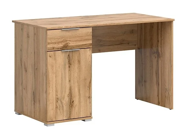 Kompaktní psací stůl MOCHO v dekoru dub wotan je ideální volba pro menší pokoje a kanceláře. Poskytuje dostatek místa pro počítač, klávesnici a další pracovní potřeby. V nohách stolu se nachází zásuvka pro drobnosti a za dvířky se ukrývá police pro organizaci dokumentů.