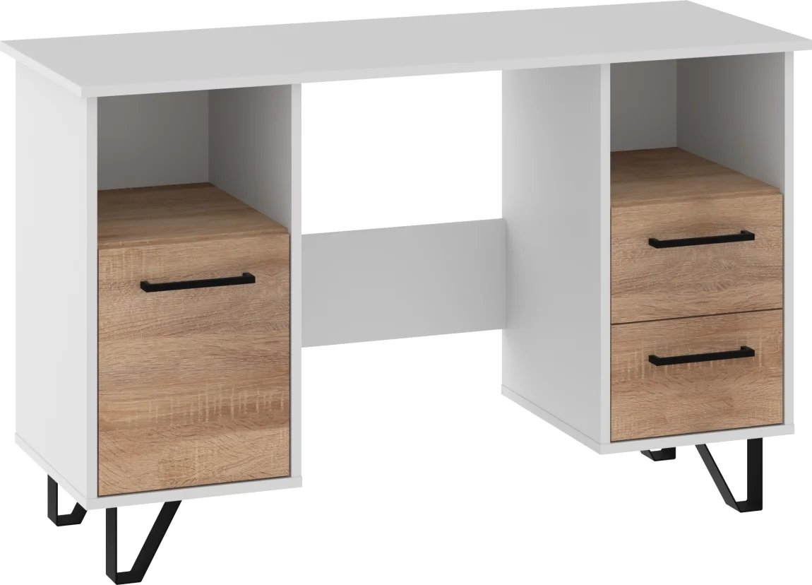 Praktický psací stůl PRUDHOE v provedení bílé s dekorem dub sonoma kombinuje jemný vzhled s praktičností. Korpus doplňují černé kovové nožky a úchytky pro kontrastní vzhled. Rozměry 120 x 75 x 46 cm nabízejí dostatek místa pro notebook, dokumenty i organizéry, zatímco výška nožek 12 cm zajišťuje pohodlnou práci.