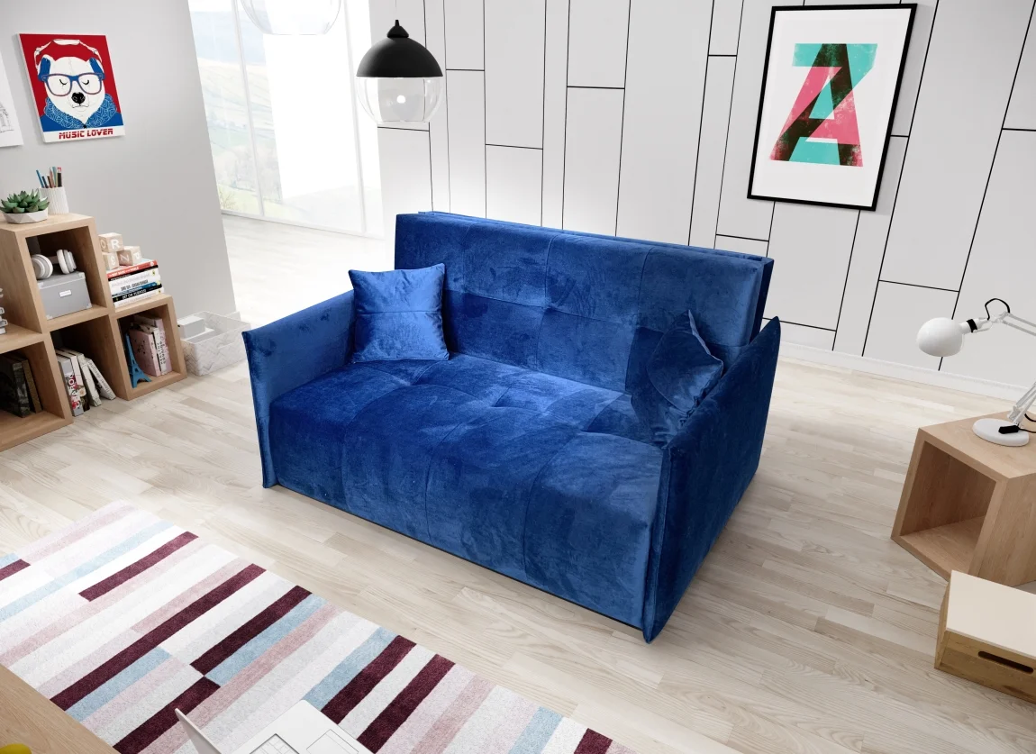Rozkládací pohovka RECBELI 3 v modré barvě zaujme praktickým dvousedákem a snadným rozložením na pohodlné lůžko pro hosty. Dvousedák lze bez námahy proměnit v ložnou plochu, což šetří prostor a poskytuje flexibilitu pro menší byty.