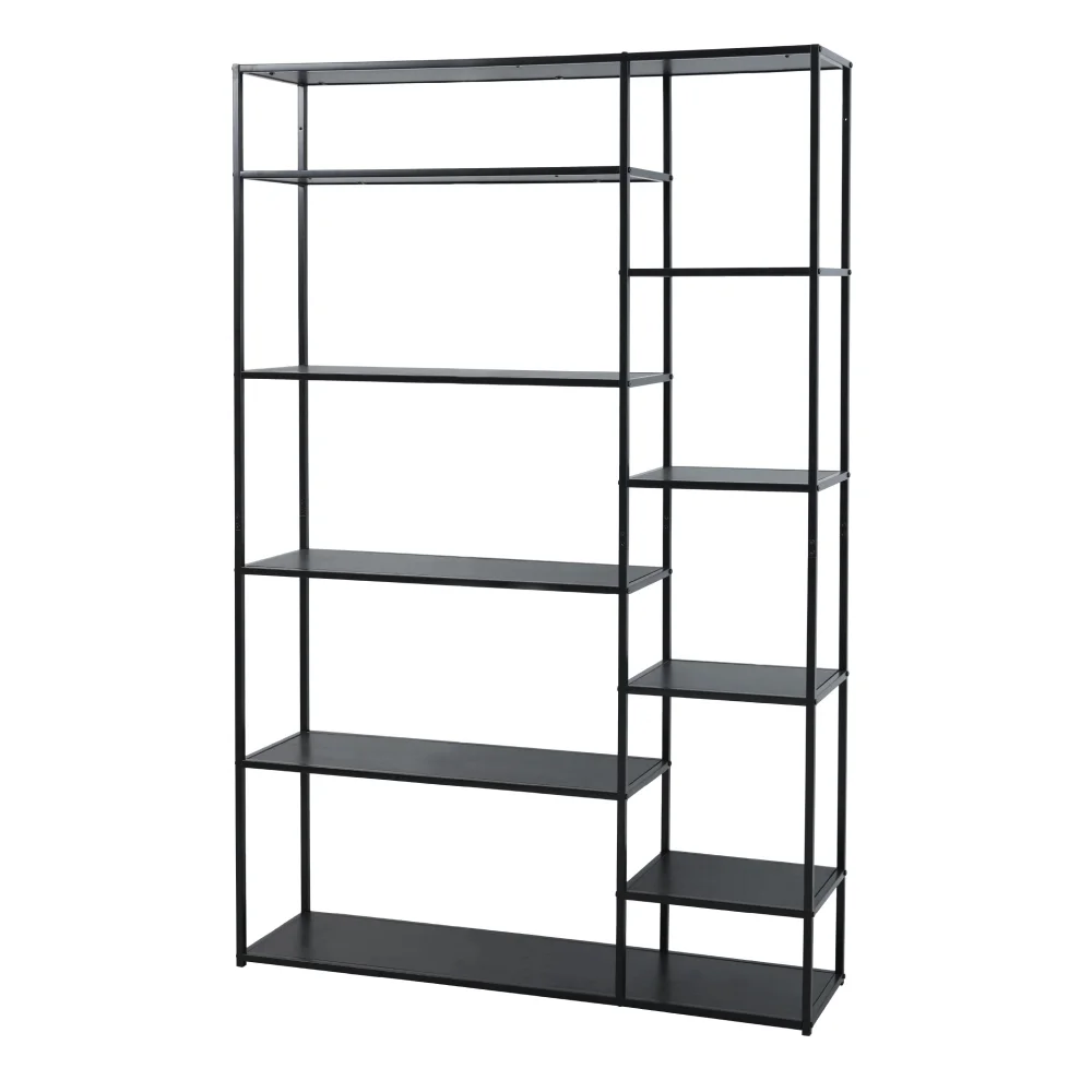 Černý regál s odolnou kovovou konstrukcí nabízí praktické otevřené úložné prostory. Rozměry: šířka 120 cm, hloubka 30 cm a výška 188 cm; výška nožiček 1 cm umožňuje jemné vyrovnání během instalace. Nosnost na jednu polici je 10 kg, takže si na deseti policích pohodlně uspořádáte knihy, dekorace a drobnosti. Regál má otevřený systém ukládání a deset polic pro rychlý přehled a snadný dosah k uloženým věcem. Doporučujeme připevnit ke zdi pro větší stabilitu; dodáváno v demontu pro pohodlnou přepravu a montáž.