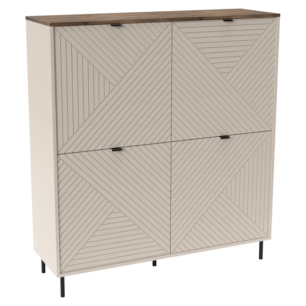 Regál EYCO 4D v provedení kašmír/dub Castello kombinuje odolnou laminovanou desku s MDF fóliovanými plochami a černými kovovými úchytkami, které podtrhují moderní design. Rozměry (ŠxHxV): 123,4 x 40 x 135,2 cm, tloušťka materiálu 1,6 cm zajišťují stabilitu a pevnost. Za čtyřmi dvířky se skrývá prostor s policiemi pro uzavřené uspořádání věcí, dekorativní dvířka dodávají regálu jemný vzhled. Korpus doplňují kovové nožičky v černé barvě s výškou 12 cm a kovové úchytky, rovněž černé, pro elegantní kontrast. Nosnost horní desky je 10 kg a každá police unese 5 kg; regál je tedy skvělým místem pro ukládání i vystavování předmětů. Doporučujeme upevnit ho ke zdi pro zvýšenou stabilitu. Dodáváno v demontu.