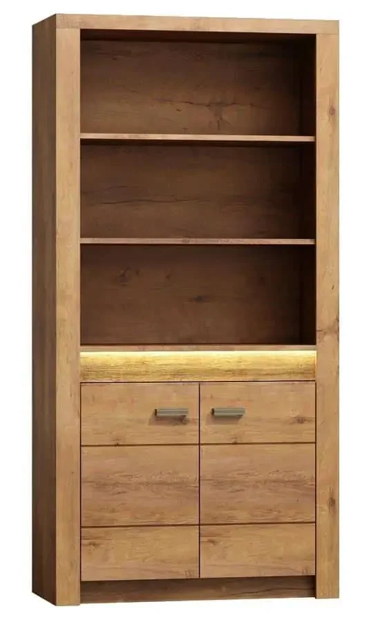 Regál z moderní kolekce INDIANAPOLIS nabízí praktický úložný prostor v provedení jasan světlý. Za dvířky se ukrývá jedna police pro uspořádání knih, dokumentů a drobných doplňků. Design je doplněn ozdobnou rýhovanou lištou, do které lze LED osvětlení doplnit a tím ještě zdůraznit charakter masivního dřeva. Celá řada vyniká jednoduchými tvary a elegantním výrazem, který šetří místo a současně působí vzdušně. Nábytek je vyroben z kvalitního lamina s ABS hranami o tloušťce 0,5–0,8 mm, což zaručuje odolnost a dlouhou životnost. Dodáváme v demontovaném stavu a připravený k rychlé montáži.