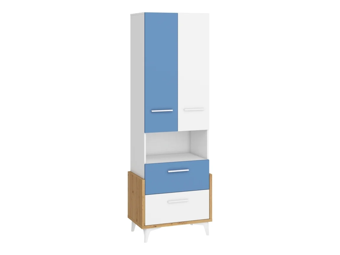 Regál LEPON vkusně kombinuje dub artisan s bílou a modrou pro svěží, moderní vzhled. Zásuvky i dvířka jsou vybavené systémem tichého dovírání, což zaručuje klidné a plynulé používání.
