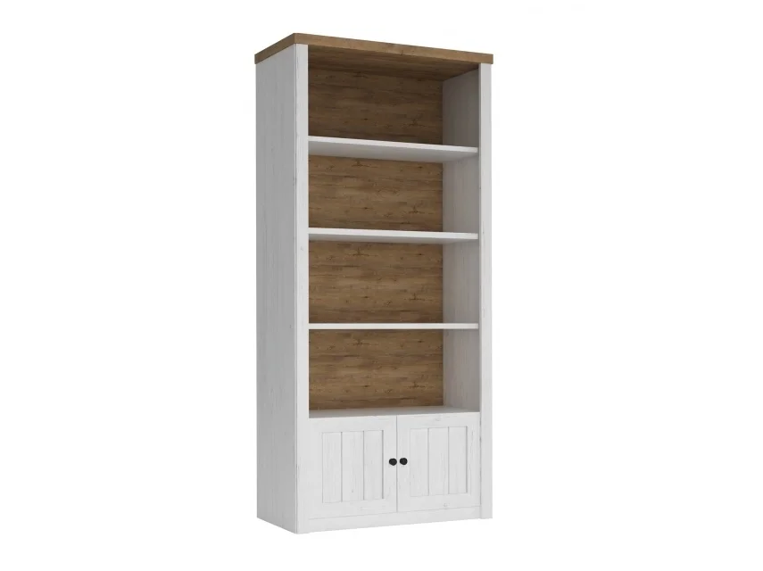 Policový regál s dvířky nabízí praktické úložné místo a přehledné rozvržení. Barva kombinuje borovici Andersen a dub Lefkas, čímž dodává interiéru teplý a moderní vzhled. Rozměry: šířka 90 cm, hloubka 43 cm a výška 198 cm umožňují efektivně využít i prostory s menšími rozměry.