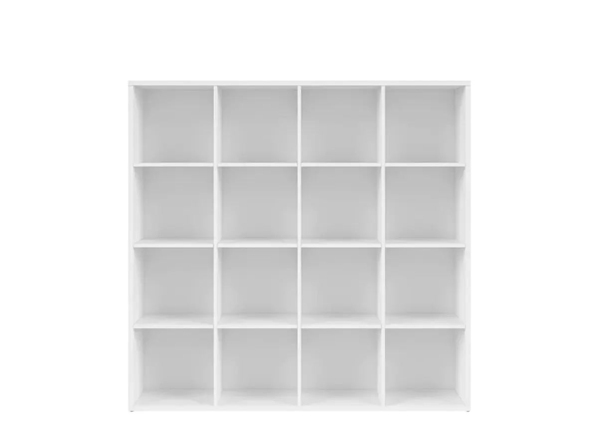 Regál REG/15/16 z dřevotřísky spojuje praktickou funkčnost s moderním designem. Je navržen jako otevřený systém s třemi dělicími stěnami, které vytvářejí 16 polic pro flexibilní uspořádání knih, dekorací a dalších věcí.