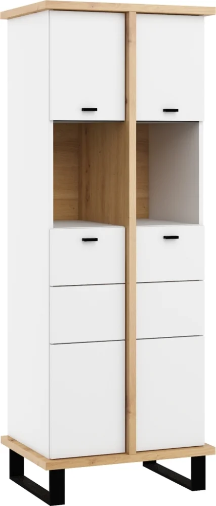 Skříňky jsou opatřeny systémem tichého dovírání, díky němuž zavírají tiše a jemně. Rozměry (š x v x h): 60 x 160 x 45 cm. Barva: dub artisan / bílá. Materiál: lamino tloušťky 16 a 25 mm s ABS hranami. Nohy z černého kovu o výšce 12 cm a úchyty v černé barvě. Dodáváno v demontu. Díky svému vzhledu se skvěle hodí do moderního interiéru a poskytuje praktické úložné prostory pro knihy, dokumenty i dekorace. K pohodlnému používání přispívá jednoduchá montáž a snadná údržba.