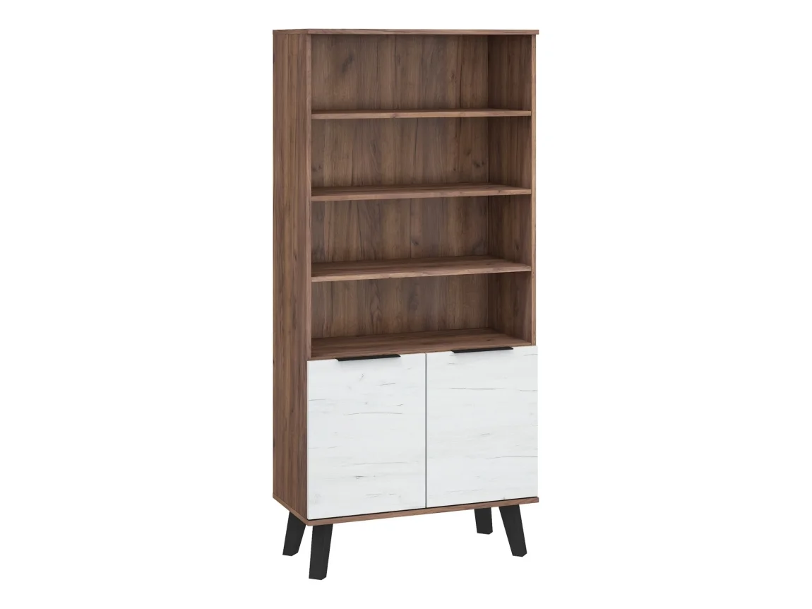 Praktický policový regál OSMAK 2D kombinuje dvě dvířka a stabilní konstrukci v barevné kombinaci craft tobaco a craft bílá. Jeho úchyty a nožky jsou v černé barvě, což dotváří moderní vzhled.