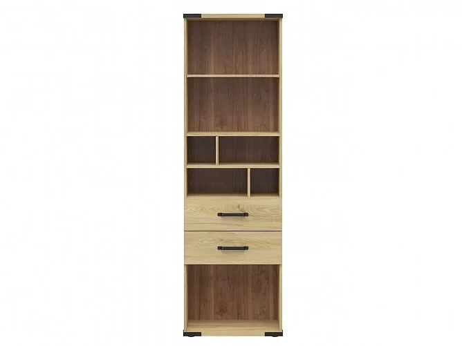 Úložný systém tvoří otevřené police a dvě zásuvky s tichým dojezdem, takže chod nábytku je tichý a plynulý. Barva kombinuje světlý jasan běloruský s černým akcentem. Rozměry (š x v x h): 60 x 197,5 x 40 cm. Materiál: lamino. Dodání probíhá v demontovaném stavu. Záruka 5 let. Díky promyšlenému uspořádání zvládne pohodlně uspořádat knihy, sešity i drobnosti a navíc působí v místnosti útulně a moderně.