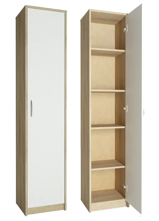 Univerzální regálová skříň VERNIO v kombinaci dub sonoma a bílé nabízí praktické úložné prostory s dvířky. Dvířka jsou oboustranná, takže montážní orientaci lze snadno nastavit na pravou i levou stranu.