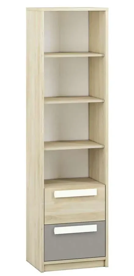 Moderní úzký regál REPENS s dvěma zásuvkami přináší praktické a stylové řešení pro menší prostory. Korpus je vyroben z kvalitní LTD desky s ABS hranou v barvě buk fjord a zásuvky jsou z LTD desky v kombinaci buk fjord a šedá.