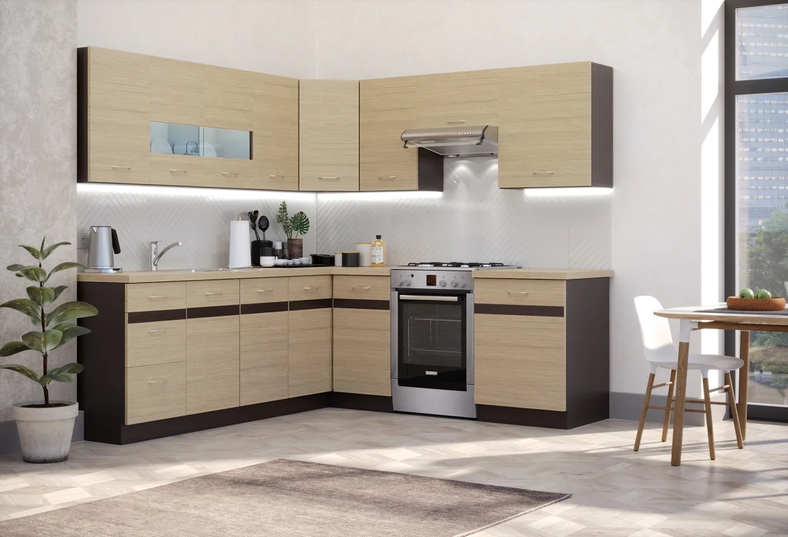 Rohová kuchyně BELISA o rozměrech 220×210 cm je modulová sestava, kterou lze doplnit o další skříňky nebo upravit tak, aby vyhovovala vašemu prostoru. Korpus je v dekoru dub wenge, horní dvířka jsou v rijeka světlá a spodní dvířka také rijeka světlá s páskou v dekoru dub wenge. Dolní skříňky mají výšku 82 cm a hloubku 45 cm; v nabídce naleznete šířky 80 cm, 40 cm a 50 cm, včetně rohové skříňky D100NW 40 cm a dalších segmentů. Horní skříňky mají výšku 57,5 cm a hloubku 29,5 cm; k dispozici jsou šířky 60 cm, 40 cm, 50 cm a 80 cm, včetně rohové G60NW 40 cm a vitríny G80W. Součástí linky je dělená pracovní deska o délkách 2×40 cm, 1×50 cm a 1×100 cm; deska pod dřez se nedodává. Předpokládaný prostor pro dřez 80×60 cm tak vyžaduje vlastní montážní desku. Dřez a spotřebiče nejsou součástí ceny. Sestava se dodává v demontu a je se zárukou 24 měsíců. Kvalitní LTD desky zajišťují dlouhou životnost a snadnou údržbu. Tato kuchyně je navržena pro moderní kuchyně s čistými liniemi a díky modulovému systému ji lze rychle a snadno přizpůsobit vašim požadavkům.
