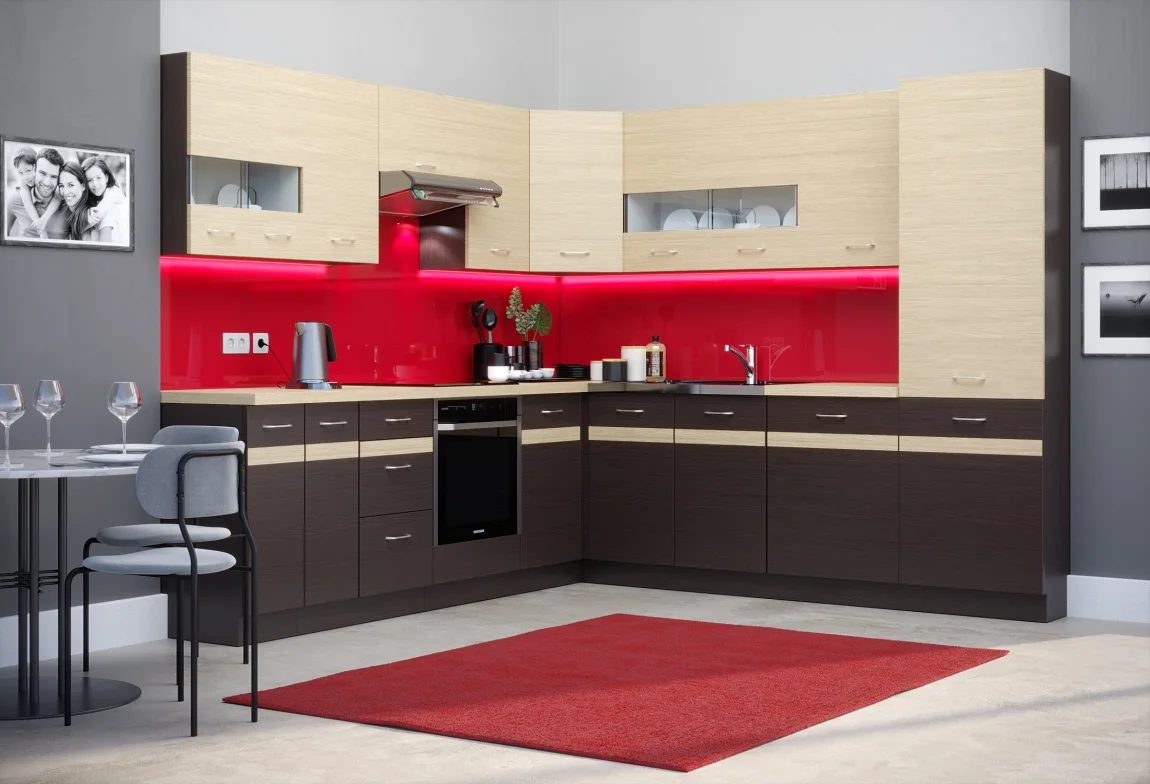 Rohová kuchyně BELISA o rozměru 260x240 cm představuje modulovou sestavu s volnou možností doplnění dalších skříněk nebo úpravy rozložení podle prostoru a vašich představ. Korpus je v dekoru dub wenge, horní dvířka v rijeka světlá a spodní dvířka doplňuje pásek v téže světlé variantě.