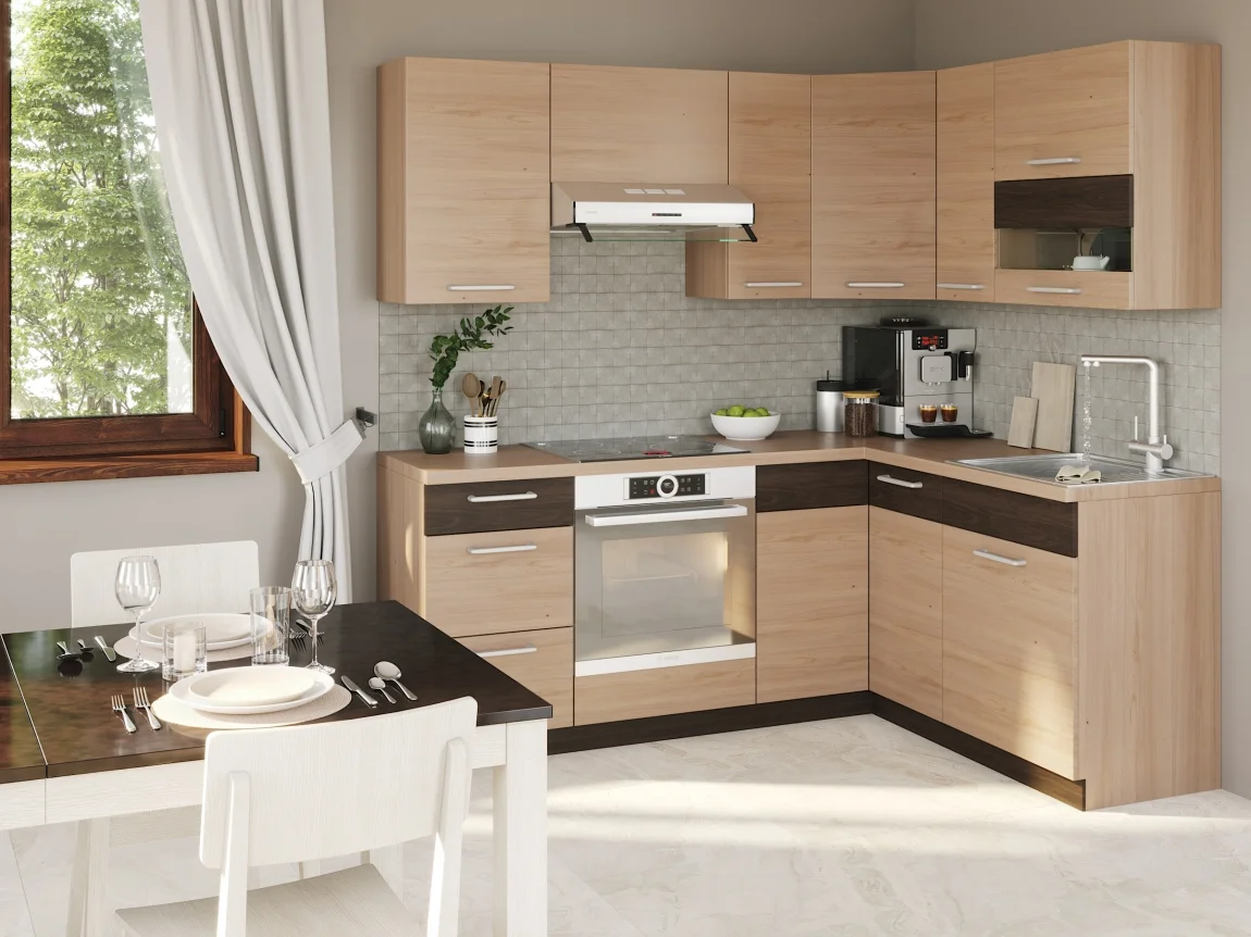 Rohová kuchyně Ruthin o rozměrech 195x150 cm představuje flexibilní modul, který lze doplnit o další skříňky a upravit podle vašeho prostoru. Korpus i dvířka jsou provedena ve stejné barvě rijeka světlá, případně lze kombinovat rijeka světlá s rijeka tmavá pro větší kontrast.